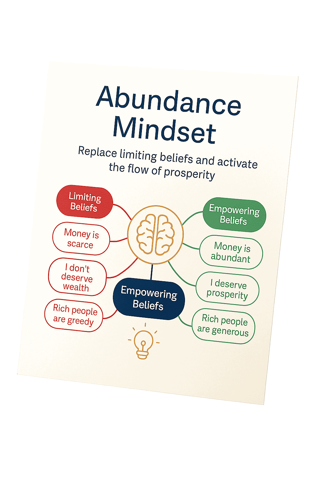 A simple, beautifully designed visual map with the main limiting beliefs about money… and which beliefs to replace them with to make room for prosperity.